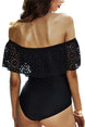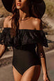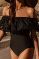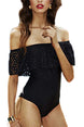 An off the shoulder silhouette instantly creates an elegant, timeless look. Invest in this swimsuit since it's something you can wear each year without questioning if it's still in fashion. The lace frill panel adds an extra dimension to this one piece. Wear with your flared trousers and chunky heels.