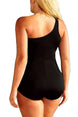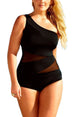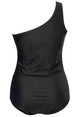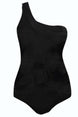 One shoulder swimsuits are glamorous by design. The mesh panels and curved wrap-around design were selected to compliment your body in the right places.  The black color makes it easy to accessorize, pair it with a monochrome sunhat and flared white trousers to look like an Old Hollywood goddess.