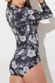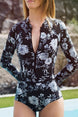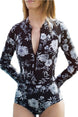 Long sleeved swimsuit featuring a floral print design and a front zipper.